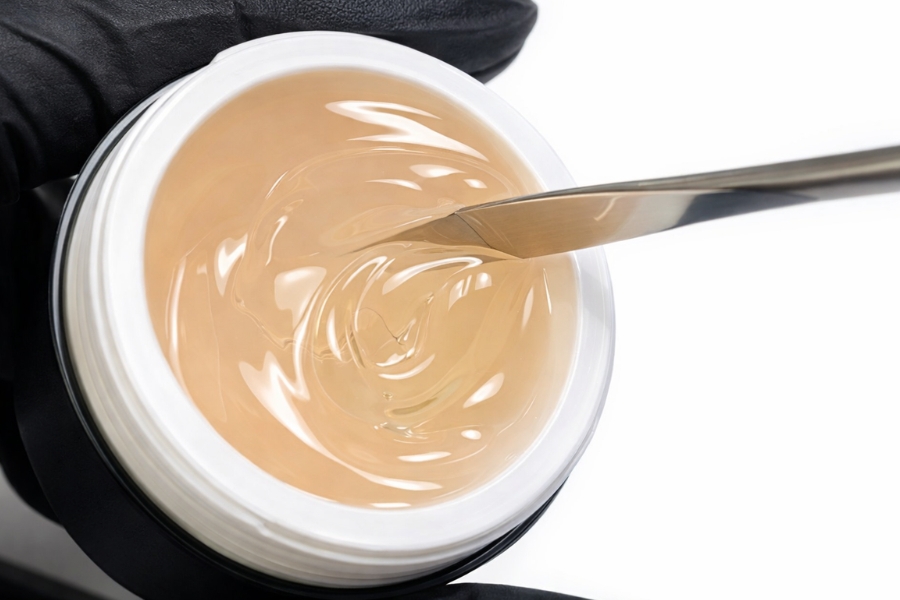 Jelly Builder 20 ist ein mittelviskoses, roséfarbenes Modelliergel (Tiegelton, auf dem Nagel nicht sichtbar), das exakt dort bleibt, wo es aufgetragen wird. Dank thixotroper Textur läuft es nicht in den Nagelfalz, ist sehr widerstandsfähig und ideal für Acryl-Umsteiger sowie kontrollierte Studioaufbauten.