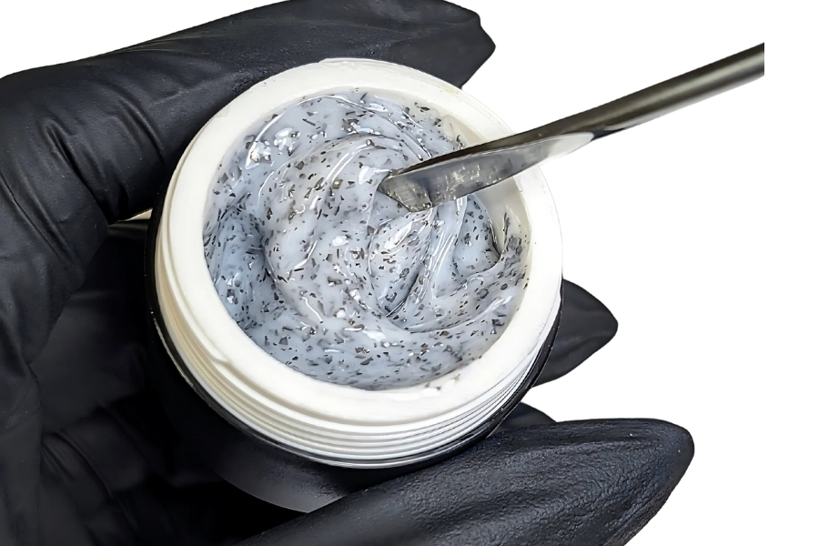 Marmor Builder 14 ermöglicht elegante Marble- und Effektlooks durch fein abgestimmte Glitterflakes direkt im Aufbau. Die thixotrope, leicht standfeste Textur sorgt für kontrollierte Modellage und gleichmäßige Ergebnisse.
